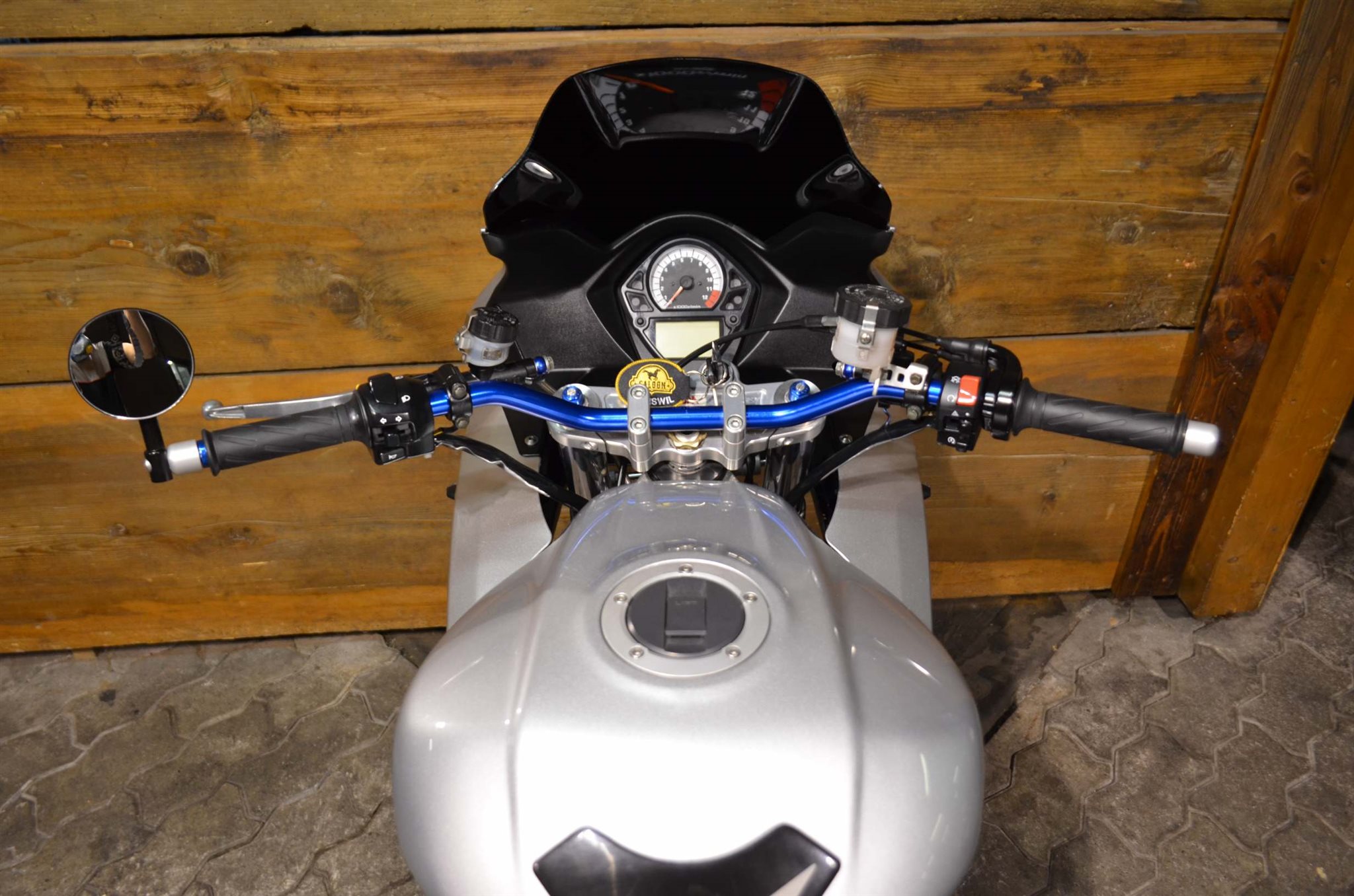 Verbautes Zubehör: Kurzheck inkl. LED Blinker, Soziusabdeckung, Lenkerendspiegel, Superbikelenker, Stahlflex Brems- und Kupplungsleitung, polierte Felgen, Kettenschutz, schwarze Scheibe, Schutzblech hinten