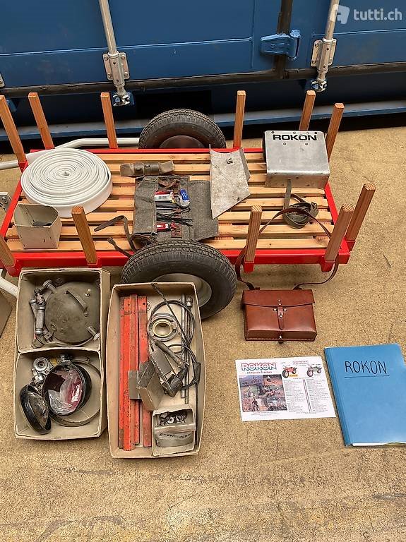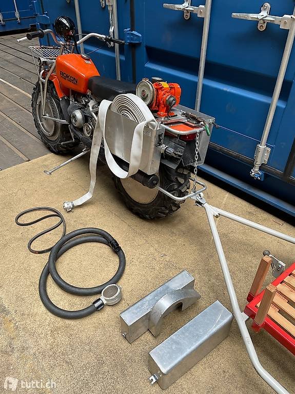 Der Rokon schwimmt ist also eine Amphibie er hat Allradantrieb und ist ein seltener Fire Ranger, mit Ansaugschlauch und Druckschlauch an der Pumpe angeschlossen, liefert der gleiche Motor ( 2 Takt 134 ccm der zum Fahren verwendet wird ),ca 6,5 Bar Druck, dadurch kann 40 m Weit gespritzt / gelöscht werden, mit diversen Unterlagen und Zubehör, dieses Unikat gehört eigentlich in ein Museum, Fahrzeug ohne Ausweis, sowas hat man noch nicht alle Tage gesehen!