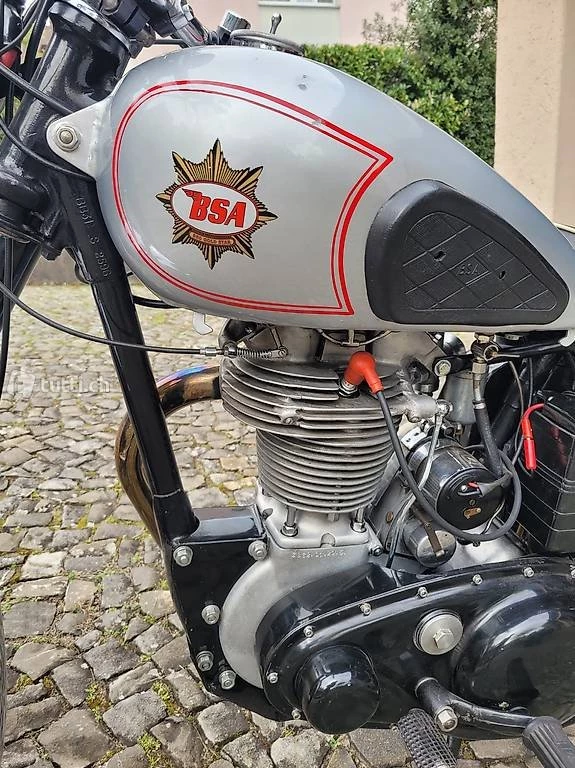 Die BSA ZB 32 Baujahr 1950 ist die sportliche Version der B31.Mit ihrem Alumotor zeigt sie schon ihr sportliches Gesicht.Mit neuen Ventilen,neuem HC Kolben und den Nockenwellen der letzten grossen Schwester(DBD 34) ,alles von einer bekannten Fachwerkstatt eingebaut ,rennt sie jeder normalen 500 -Einzylindermaschine aus dieser Epoche davon.Damit die Kraft auch auf das kräftige Getriebe übertragen wird,fand eine moderne Newby Kupplung Verwendung .Das Motorrad ist in sehr schönem Zustand,letzte MFK 2020 mit Veteraneneintrag.