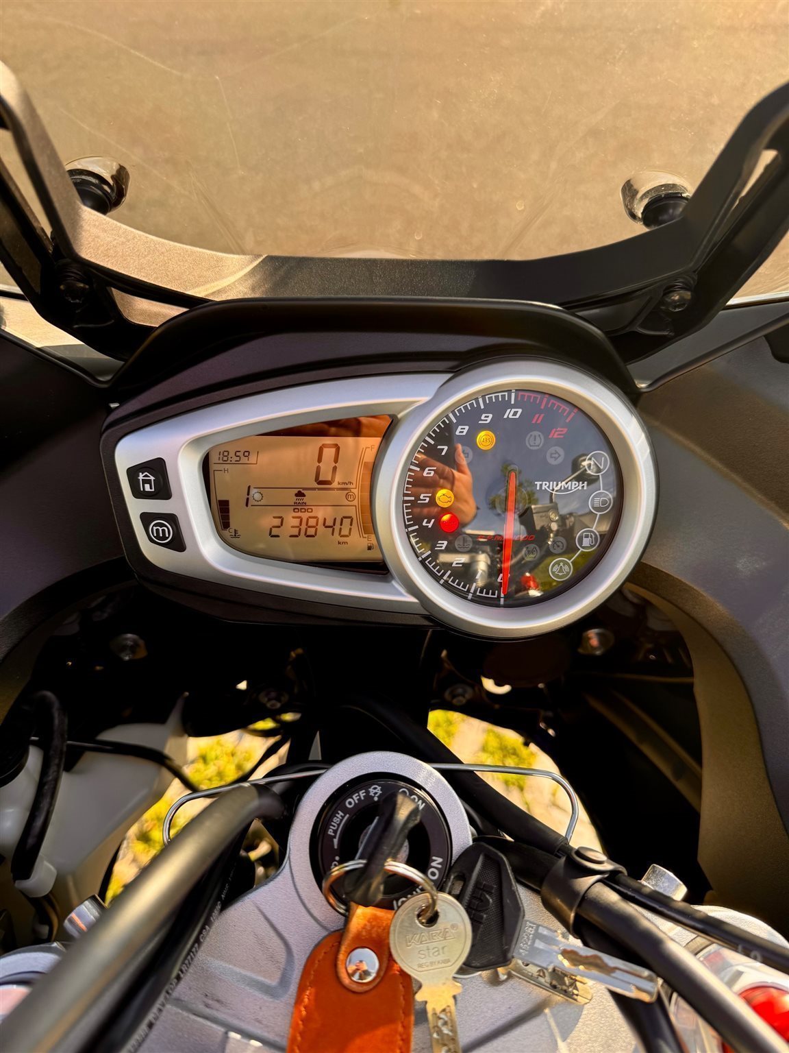 Gepflegtes Motorrad inklusive Topcase für 2 Intergralhelme, Hecksatteltasche, SC-Project Endschalldämpfer, Zentralständer und Griffheizung. ABS, Traktionskontrolle, Fahrmodi, Tempomat. Keine bekannten Mängel, letzter Service April 25 bei Triumph Vertretung.