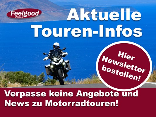 Du reist am liebsten mit dem Motorrad und gehst gern auf Tour? Um deinen nächsten Motorradurlaub gut informiert zu planen, sind aktuelle Motorradreise-News hilfreich. Auch für Motorradtouren mit Freunden können günstige Angebote nützlich sein. Mit dem Newsletter der Motorrad-Touren-Profis von Feelgood Reisen verpasst du keine News und bist immer auf dem Laufenden über aktuelle Angebote.