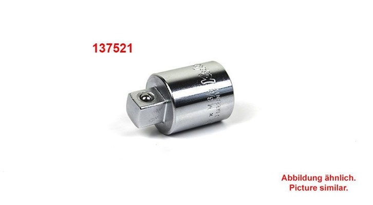 Artikel 137521: Adapter für 1/2" auf 3/8" zur Benutzung einer 1/2"-Ratsche. 12,5 mm (1/2")-Vierkantantrieb für handbetätigte Steckschlüssel-Einsätze und Kugelarretierung. Chrom-Vanadium-Stahl, verchromt und geschliffen. 12,5 mm (1/2")-Innenvierkant auf 10,0 mm (3/8")-Außenvierkant. Artikel 23566: Adapter 3/8 Zoll auf 1/2 Zoll 3/8 Zoll (10,0 mm) Innenvierkant auf 1/2 Zoll (12,5 mm) Außenvierkant