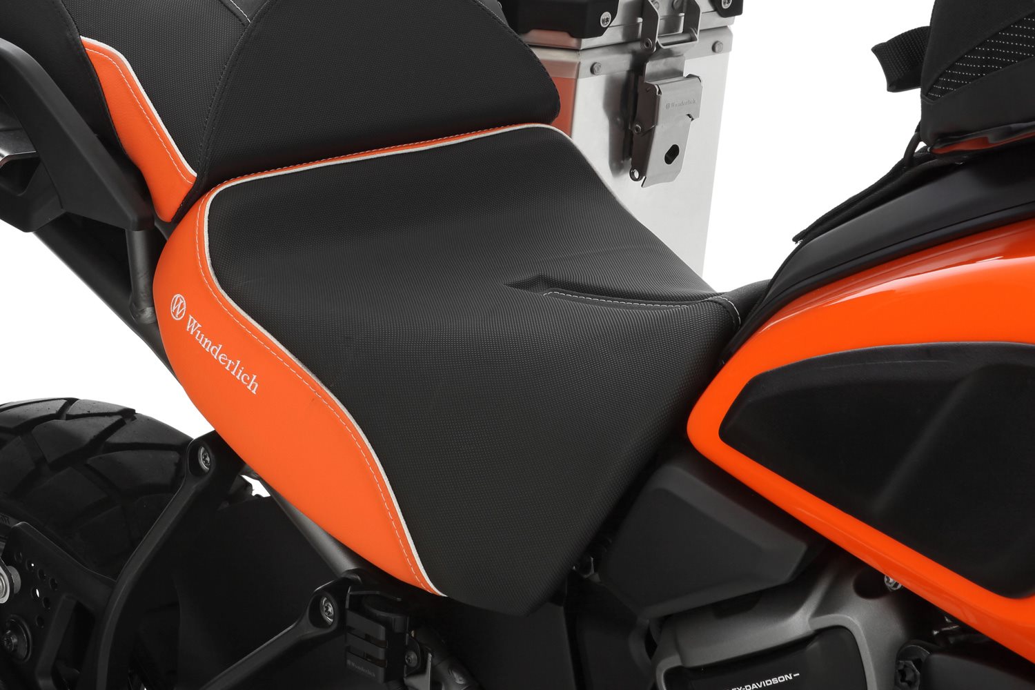 Wir fertigen unsere Sitze mit einer charakteristischen, ergonomischen 3-D-Kontur, die den Fahrer mit seinem Motorrad eins werden lässt. Form und Neigung des aufwändig verarbeiteten Sitzbankkerns unterstützen die ergonomische vorteilhafte, natürliche Haltung des Beckens. So integriert, fährt es sich einfach entspannt und damit aktiv. Und, kein Zweifel, entspanntes Sitzen schafft ein Plus an passiver Sicherheit. Bei unseren ThermoProFahrer- und Beifahrersitzbänken liegt die Temperatur der Sitzfläche im Hochsommer in praller Sonne um bis zu 25°C niedriger im Vergleich mit herkömmlichem Bezugsmaterial. Passend dazu haben wir eine Beifahrersitzbank im Programm. Für alle AKTIVKOMFORT-Sitzbänke gilt: Sie bieten perfekten Halt und aktive, sichere Kontrolle bei forcierter Fahrt, ganz besonders auch beim Bremsen: Wer kennt das nicht, wenn die Sozia beim Ankern plötzlich von hinten schiebt und man sich unvermittelt abstützen und gleichzeitig, in einer vielleicht brenzligen Lage, auch noch lenken muss. Mit Wunderlichs eigens entwickelter Stützkontur gehören diese Schreckmomente beim Bremsen der Vergangenheit an. Die innovative, ergonomische 3-D-Kontur sorgt auch dafür, dass Druckstellen an den Innenschenkeln beim Stehen an der Ampel, passé sind. Die Fakten: Funktion Technische Daten BesonderheitenBeschreibung zu Wunderlich Fahrer Sitzbank AKTIVKOMFORT Pan America 1250 - schwarz-orange - Standard anzeigen