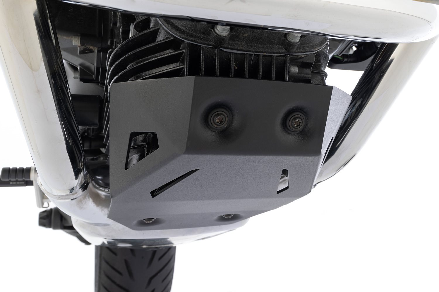 Das funktionale Edge-Design und die konstruktive Integration unseres aus Aluminium gefertigten, einteiligen Motorschutzes PURE bietet den umfassenden Schutz für das Motorgehäuse und die Ölwanne. Die frontalen, seitlich rechts und links eingegliederten Ventilationsöffnungen unterstützen die Kühlung des Motors, besonders wenn es lange Distanzen auf der Autobahn zu überwinden gilt. Angewinkelte Prallbleche lenken Steinschlag oder Fremdkörper, die vom Vorderrad aufgewirbelt werden, jedoch so ab, dass die Gefahr für Beschädigungen am Motor erheblich reduziert wird. Ein weiterer Vorteil dieses Motorschutzes ist: Er lenkt schwallartig aufgewirbeltes Spritzwasser zum Beispiel beim Queren von Spurrinnen nach unten ab und sorgt besonders bei heißem Motor dafür, den thermischen Stress am Motorgehäuse und Dichtungen erheblich zu mildern.
