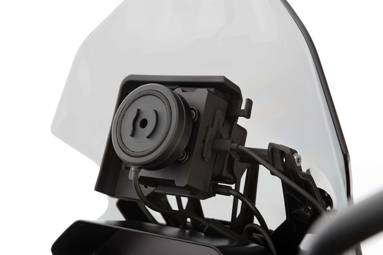 Das zentral angeordnete Schraubgewinde dient der Aufnahme unseres SP-Connect-Anti Vibration Moduls SPC+ mit induktiver Ladefunktion, das Bestandteil dieses Sets ist. Das Anti Vibrations-Modul ist die innovative Antwort auf die immer empfindlicheren neuen Smartphones. Diese bestehen aus sensiblen Bauteilen, die durch anhaltende Vibrationen vom Motor und Fahrwerk in Mitleidenschaft gezogen werden könnten. Das Anti Vibration Modul reduziert diese Vibrationen dank der effektiven Dämpfung des speziell entwickeltem Elastomer-Inlays um bis zu 60 %. Eingeschraubt kann das Modul zur Aufnahme von Smartphones genutzt werden. Das 60 Zentimeter lange Kabel der induktiven Ladefunktion ist mit einem USB-C Stecker ausgestattet und kann zur Stromversorgung wahlweise direkt mit der Ladebox oder mit einer Bordsteckdose verbunden werden.