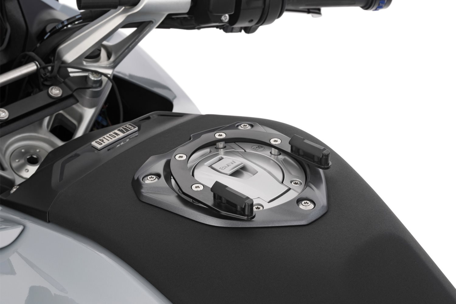 Der modellspezifische, sogenannte Tankring bildet die solide Basis zur sicheren, mechanischen Arretierung der CLICK BAG Tankrucksäcke. Zum Befestigen wird der CLICK BAG von oben in die beiden Führungen des Tankrings eingesetzt, bis das Schloss automatisch verriegelt. Mit einem Riemen am Tankrucksack lässt sich die Arretierung mit einem Zug lösen. So kann der Tankrucksack im Handumdrehen - zum Beispiel zum Tanken abgenommen werden.