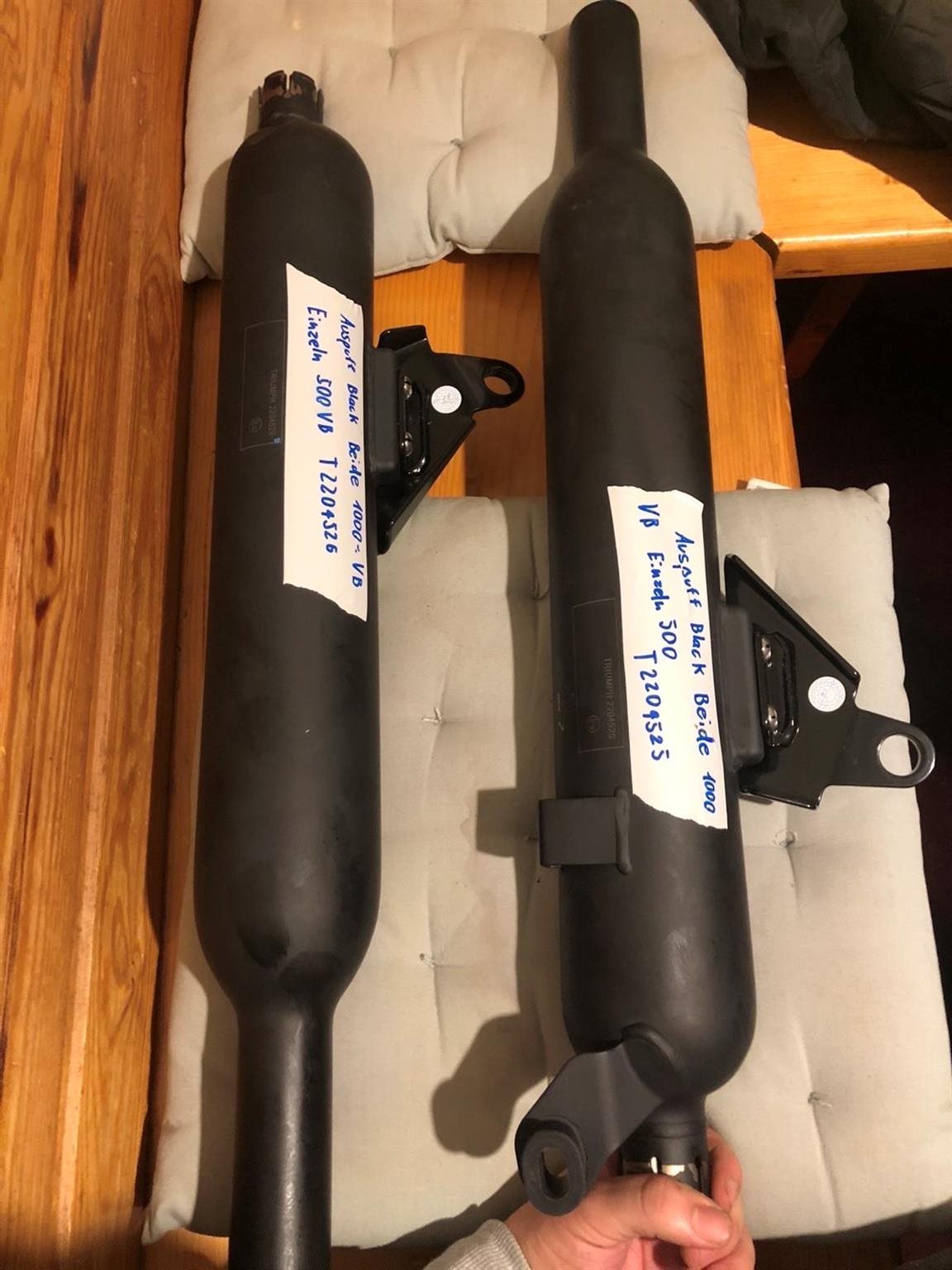 4x Original Auspuffrohre (links (T2204168 | Schalldämpfer LH Gebürstet), (T2204525 | Silencer Assy LH Blk), rechts (T2206169 | Silencer RH Brushed), (T2204526 | Silencer Assy RH Blk) ( 2 Mittelteile / Vorschalldämpfer)