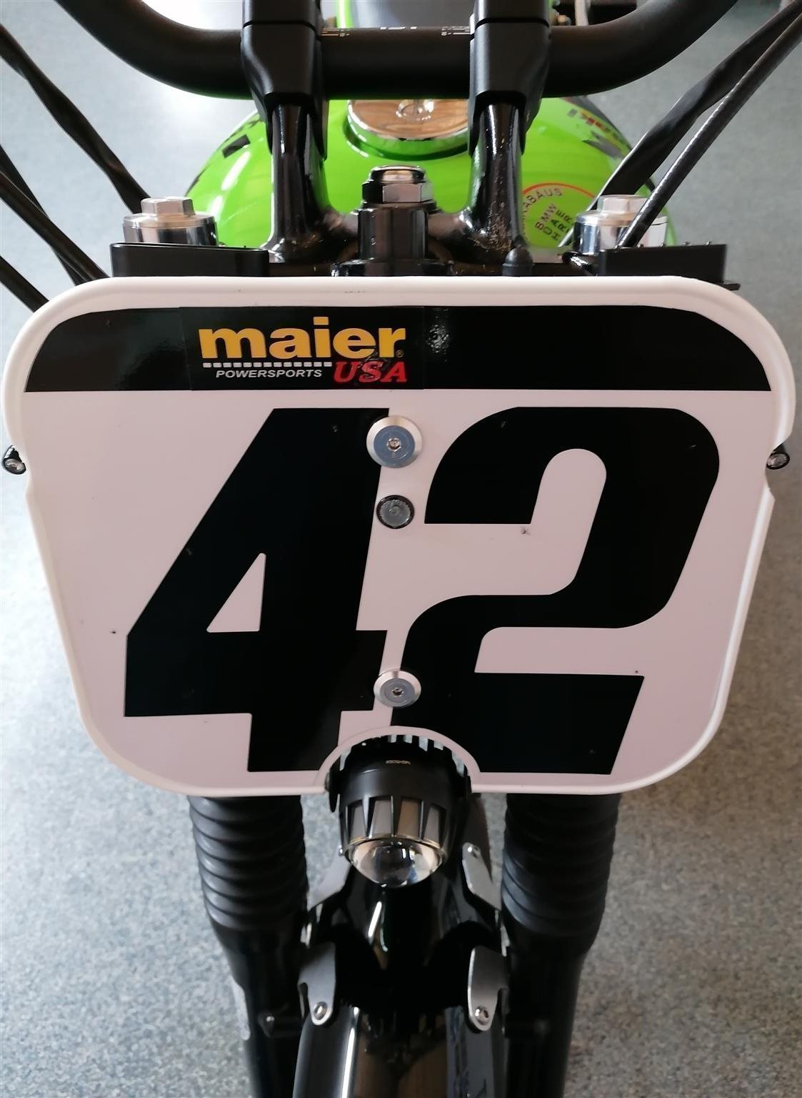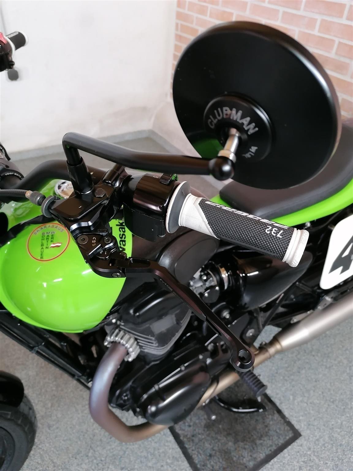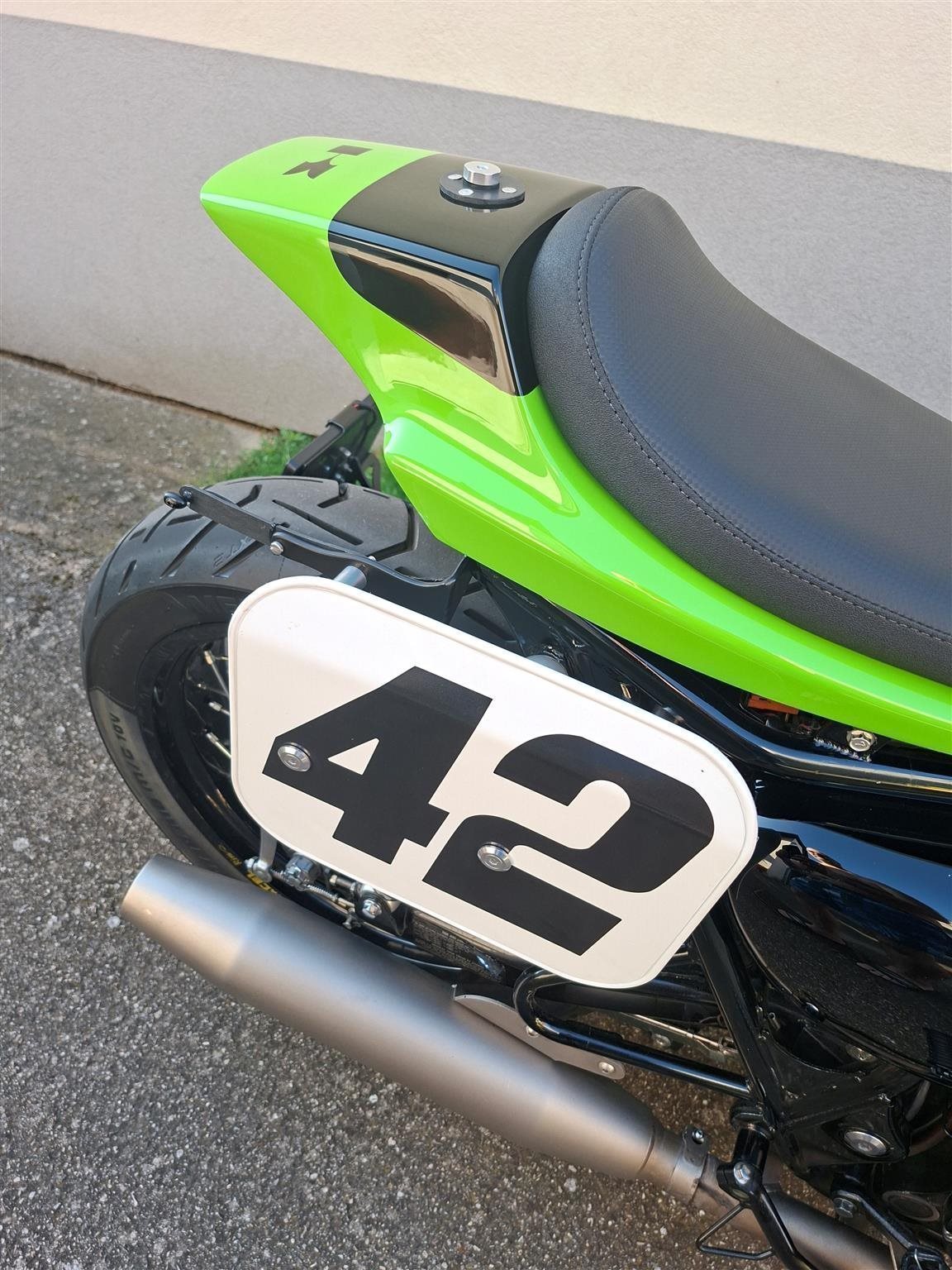 Umbau zum Flat Tracker nach Amerikanischen Style mit Königswellenmotor 48 PS und 60 Nm . Wurde einem Motorrad nachempfunden das bryan smith 2015 in der Amerikanischen Flat Track Meisterschaft gefahren hat . Allerdings wurde da ein anderes Modell von Kawasaki verwendet nähmlich eine Ninja 650 umgebaut zum Flat Tracker . Seinem Motorrad von damals ist meine von Style her nachgebaut . Alle Teile sind vom TÜV abgenommen und eingetragen . Ich wollte ein Motorrad so aufbauen das vom Aussehen nach es einem Race Bike sehr ähnlich ist aber die Anbauteile die im Straßenverkehr notwendig sind nicht sofort ins Auge fallen . Blinker , Licht und Tachoeinheit sind minimalistisch ausgeführt aber zugelassen . Teile von Remus , Wilbers , Kellerman , LSL , Voigt , Motogadget , Bremsscheibe Braking ( Wave ) , Reifen Dunlop DT 3 R mit Straßenzulassung und Felgenringe von Excel und noch viele andere wurden verwendet . Es sind jetzt breitere Reifen in den Dimensionen vorne 120 / 70 / 19 " und hinten 150 / 70 / 18 " montiert ( Original sind vorne 100 / 90 / 19 " und hinten 130 / 80 / 18 " ) . Die Teile und Modifikationen hier alle aufzulisten würde zu lange dauern und wahrscheindlich nicht alle Interessieren . Eure Meinung zum Umbau würde mich Interessieren . Was hättet ihr anders gemacht und was gefällt ? Danke und Allzeit gute Fahrt . Die Letzten Bilder zeigen das Motorrad mit Metzeler Tourance next 2 Bereifung und Carbon Heck das wahlweise verwendet werden kann . " Motorrad ist unter Umständen auch zu verkaufen " . ( Einsitzer und auch keine Reisemaschine ) ! Für Sammler und Eisdielen bzw. Promenaden " Heizer " .