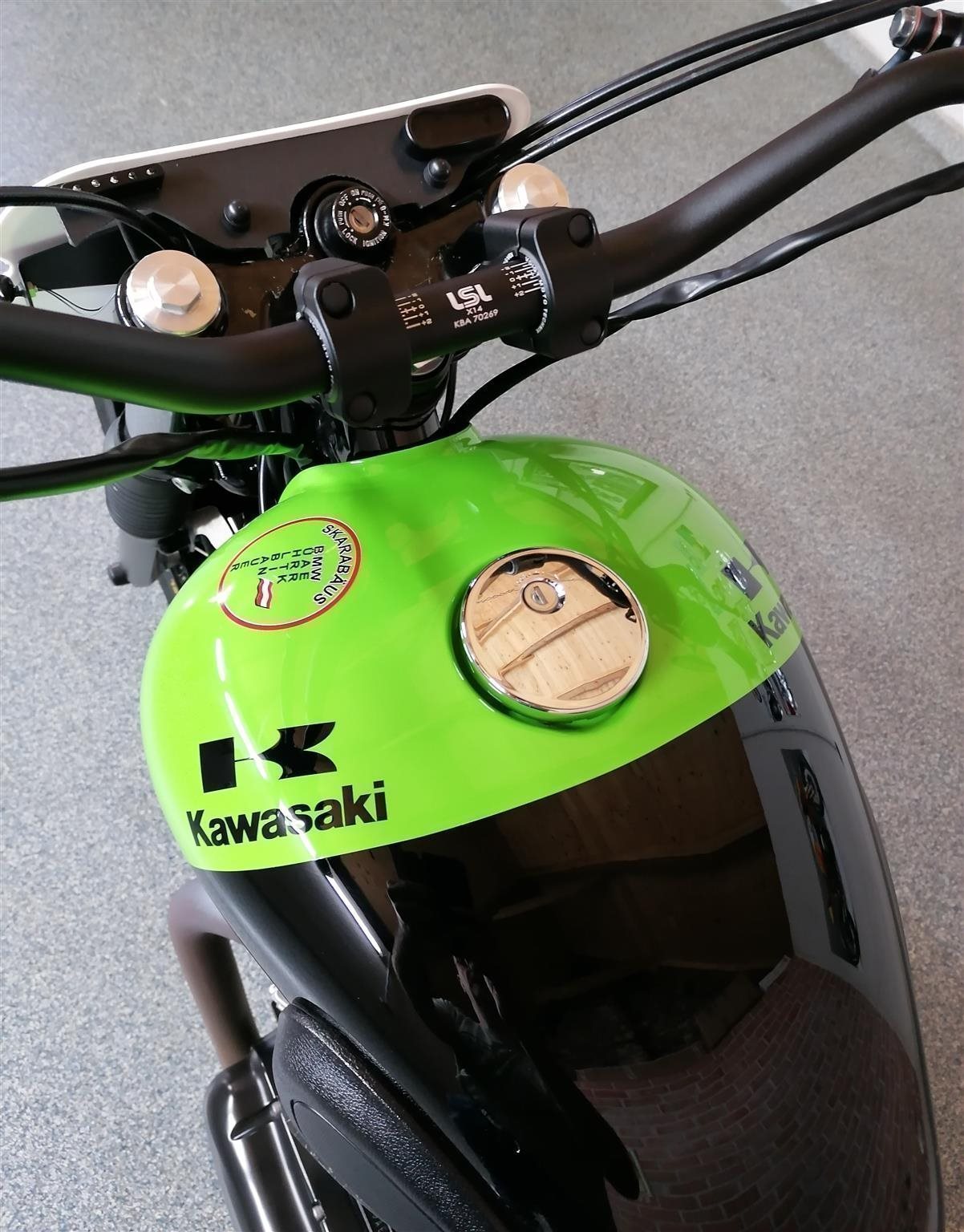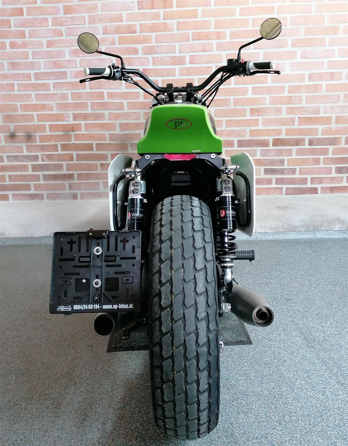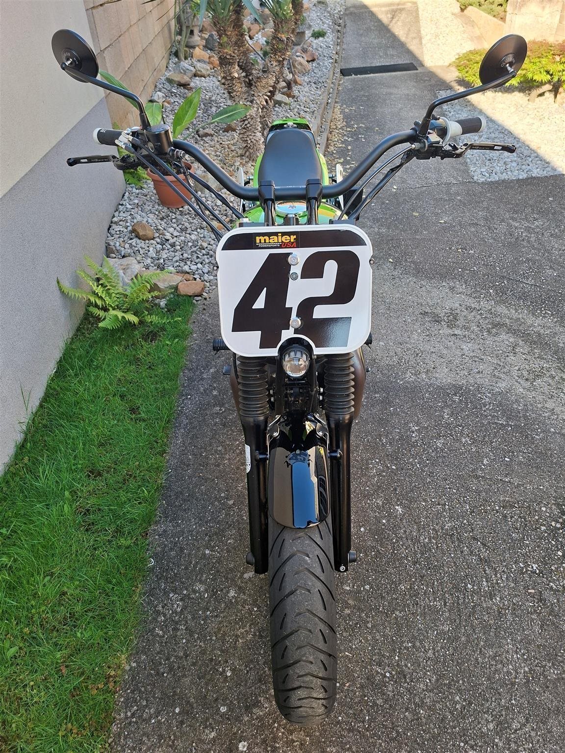 Umbau zum Flat Tracker nach Amerikanischen Style mit Königswellenmotor 48 PS und 60 Nm . Wurde einem Motorrad nachempfunden das bryan smith 2015 in der Amerikanischen Flat Track Meisterschaft gefahren hat . Allerdings wurde da ein anderes Modell von Kawasaki verwendet nähmlich eine Ninja 650 umgebaut zum Flat Tracker . Seinem Motorrad von damals ist meine von Style her nachgebaut . Alle Teile sind vom TÜV abgenommen und eingetragen . Ich wollte ein Motorrad so aufbauen das vom Aussehen nach es einem Race Bike sehr ähnlich ist aber die Anbauteile die im Straßenverkehr notwendig sind nicht sofort ins Auge fallen . Blinker , Licht und Tachoeinheit sind minimalistisch ausgeführt aber zugelassen . Teile von Remus , Wilbers , Kellerman , LSL , Voigt , Motogadget , Bremsscheibe Braking ( Wave ) , Reifen Dunlop DT 3 R mit Straßenzulassung und Felgenringe von Excel und noch viele andere wurden verwendet . Es sind jetzt breitere Reifen in den Dimensionen vorne 120 / 70 / 19 " und hinten 150 / 70 / 18 " montiert ( Original sind vorne 100 / 90 / 19 " und hinten 130 / 80 / 18 " ) . Die Teile und Modifikationen hier alle aufzulisten würde zu lange dauern und wahrscheindlich nicht alle Interessieren . Eure Meinung zum Umbau würde mich Interessieren . Was hättet ihr anders gemacht und was gefällt ? Danke und Allzeit gute Fahrt . Die Letzten Bilder zeigen das Motorrad mit Metzeler Tourance next 2 Bereifung und Carbon Heck das wahlweise verwendet werden kann . " Motorrad ist unter Umständen auch zu verkaufen " . ( Einsitzer und auch keine Reisemaschine ) ! Für Sammler und Eisdielen bzw. Promenaden " Heizer " .
