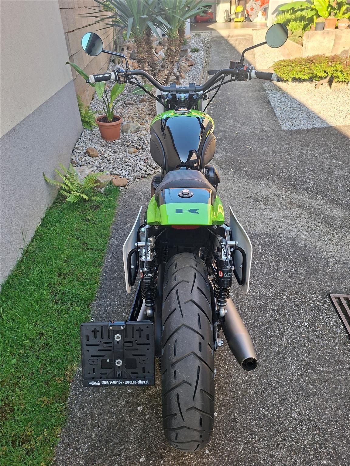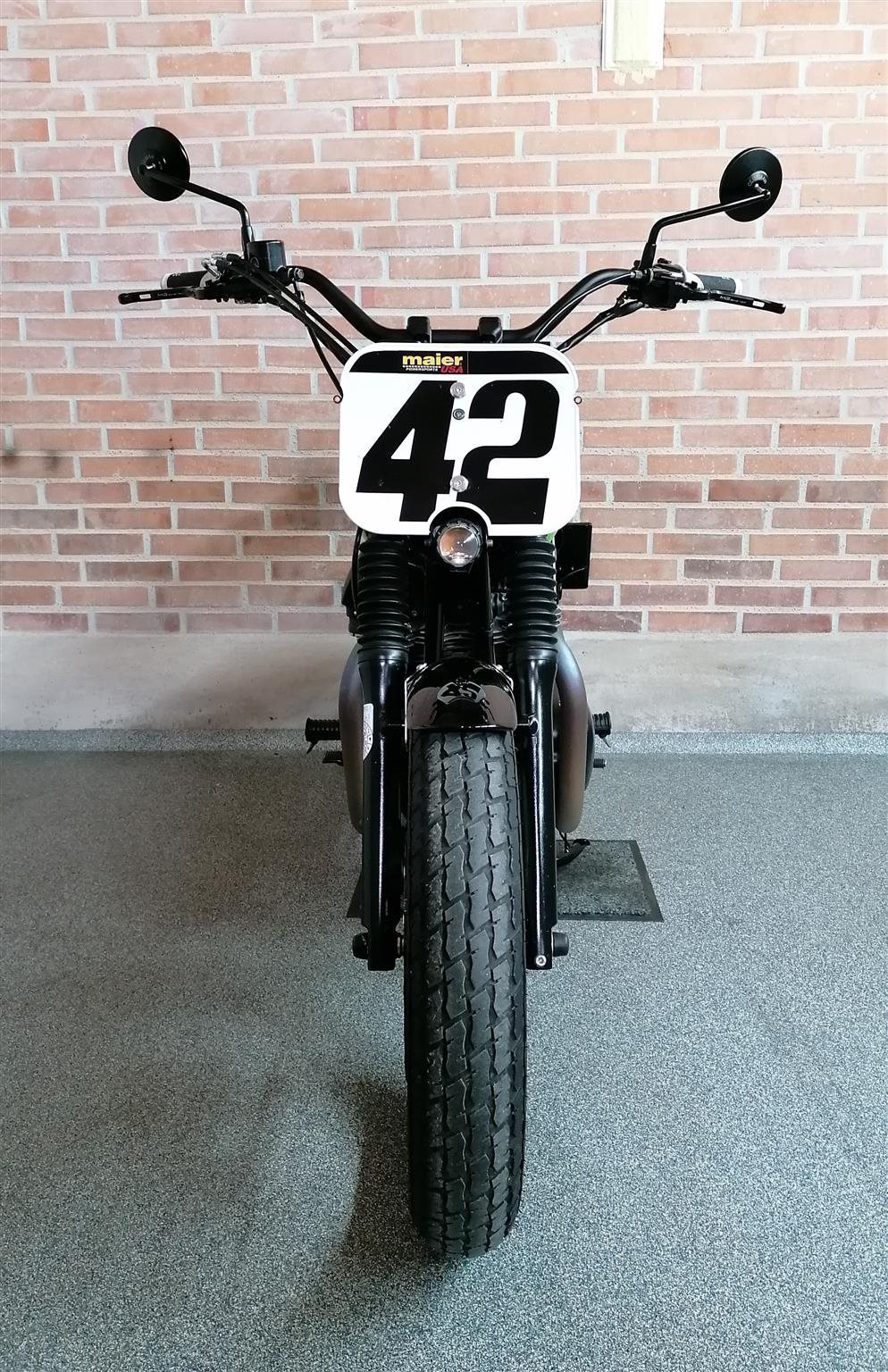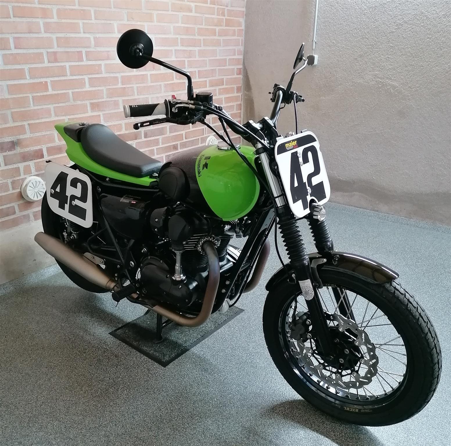 Umbau zum Flat Tracker nach Amerikanischen Style mit Königswellenmotor 48 PS und 60 Nm . Wurde einem Motorrad nachempfunden das bryan smith 2015 in der Amerikanischen Flat Track Meisterschaft gefahren hat . Allerdings wurde da ein anderes Modell von Kawasaki verwendet nähmlich eine Ninja 650 umgebaut zum Flat Tracker . Seinem Motorrad von damals ist meine von Style her nachgebaut . Alle Teile sind vom TÜV abgenommen und eingetragen . Ich wollte ein Motorrad so aufbauen das vom Aussehen nach es einem Race Bike sehr ähnlich ist aber die Anbauteile die im Straßenverkehr notwendig sind nicht sofort ins Auge fallen . Blinker , Licht und Tachoeinheit sind minimalistisch ausgeführt aber zugelassen . Teile von Remus , Wilbers , Kellerman , LSL , Voigt , Motogadget , Bremsscheibe Braking ( Wave ) , Reifen Dunlop DT 3 R mit Straßenzulassung und Felgenringe von Excel und noch viele andere wurden verwendet . Es sind jetzt breitere Reifen in den Dimensionen vorne 120 / 70 / 19 " und hinten 150 / 70 / 18 " montiert ( Original sind vorne 100 / 90 / 19 " und hinten 130 / 80 / 18 " ) . Die Teile und Modifikationen hier alle aufzulisten würde zu lange dauern und wahrscheindlich nicht alle Interessieren . Eure Meinung zum Umbau würde mich Interessieren . Was hättet ihr anders gemacht und was gefällt ? Danke und Allzeit gute Fahrt . Die Letzten Bilder zeigen das Motorrad mit Metzeler Tourance next 2 Bereifung und Carbon Heck das wahlweise verwendet werden kann . " Motorrad ist unter Umständen auch zu verkaufen " . ( Einsitzer und auch keine Reisemaschine ) ! Für Sammler und Eisdielen bzw. Promenaden " Heizer " .
